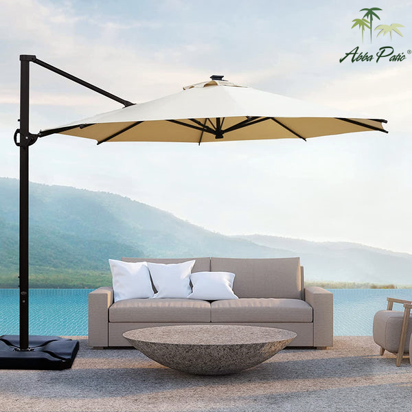 Abba Patio Vienna Cantilever Umbrella provides shade but also saves your patio space and adds beauty. This umbrella features a 6-level tilt, 360-degree rotation, and an effortless crank-lift operation system, it's the epitome of comfort and sophistication for your outdoor retreat.